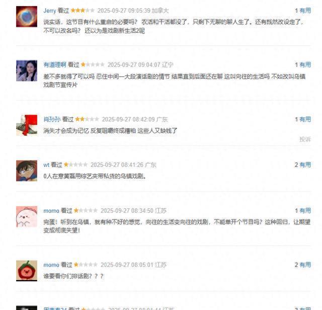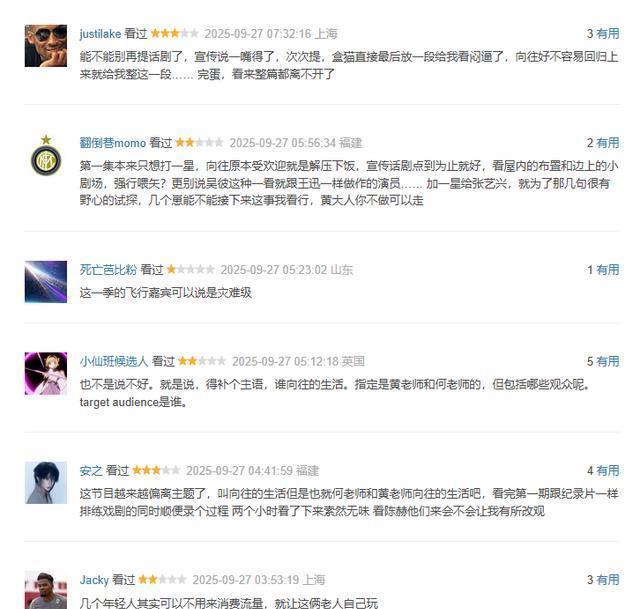这期节目播出之后,在豆瓣短评区域,已经形成了连成一片的差评规模。以往的综艺节目,再难看,也是差评和好评夹杂出现的。这一次的《向往的生活》,竟然出现了差评和差评连成片,好评零星没几个的状态。面对这些真实观众的大面积差评,黄磊等人确实应该认真反思了。 目前,观众们差评最多的,便是这一期节目的无聊。节目形式和内容可以变动,但不能让观众们感觉无聊。该节目在豆瓣的讨论区当中,甚至于出现了一个条目,大家在讨论,看到这期节目的哪个时间段上,就关闭了电视机。有说看个开局,就觉得无聊,关闭电视机的。也有说,看到他们排练话剧的时候,觉得太无聊,关闭的。
